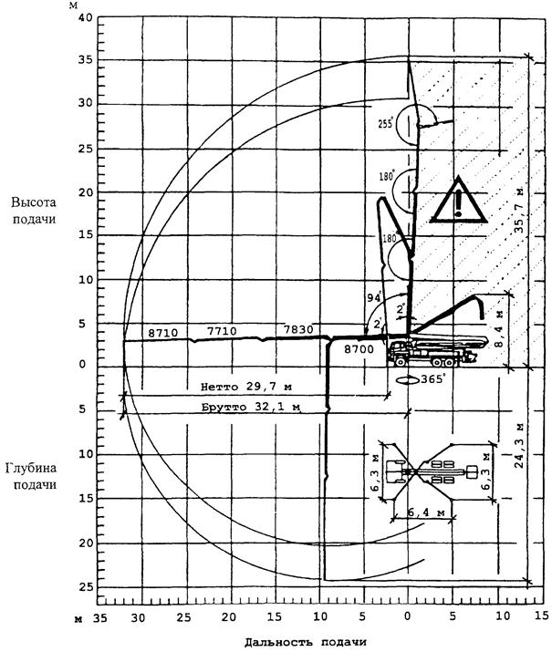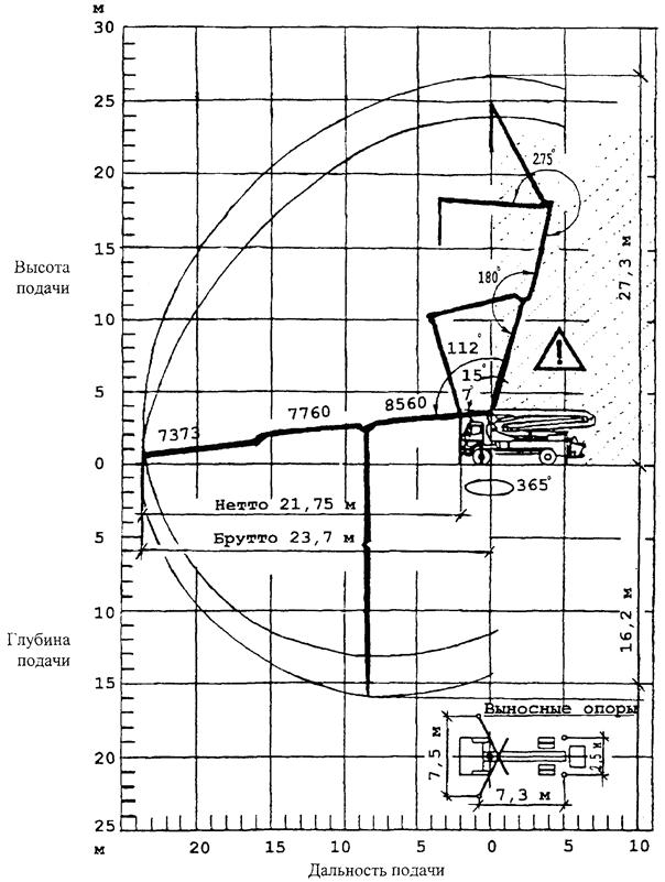 ВОЗМОЖНЫЕ ЗОНЫ ПОДАЧИ И РАСПРЕДЕЛЕНИЯ БЕТОНА АВТОБЕТОНОНАСОСОМ ТИПА «SCHWING» С РАСПРЕДЕЛИТЕЛЬНОЙ СТРЕЛОЙ ТИПА KVM 24-4H С ПОМОЩЬЮ БЕТОНОВОДА ИЗ КОМПЛЕКТА ТРУБ