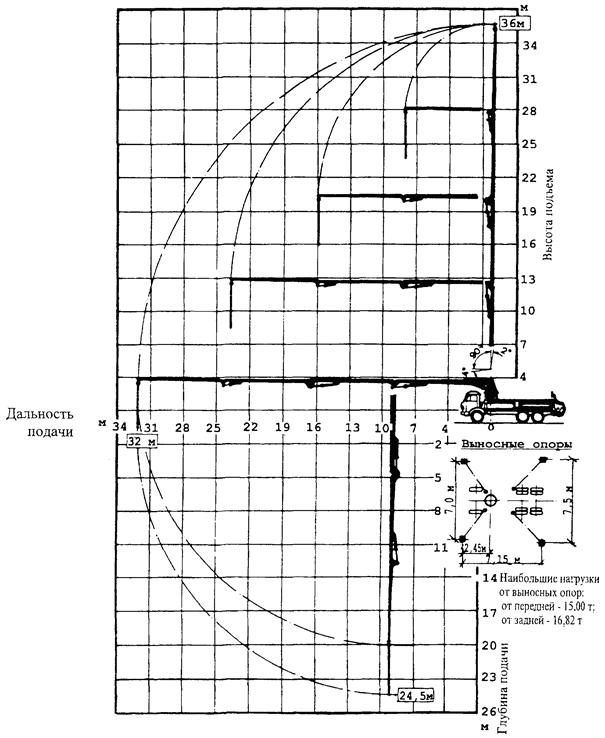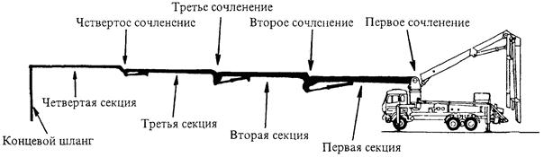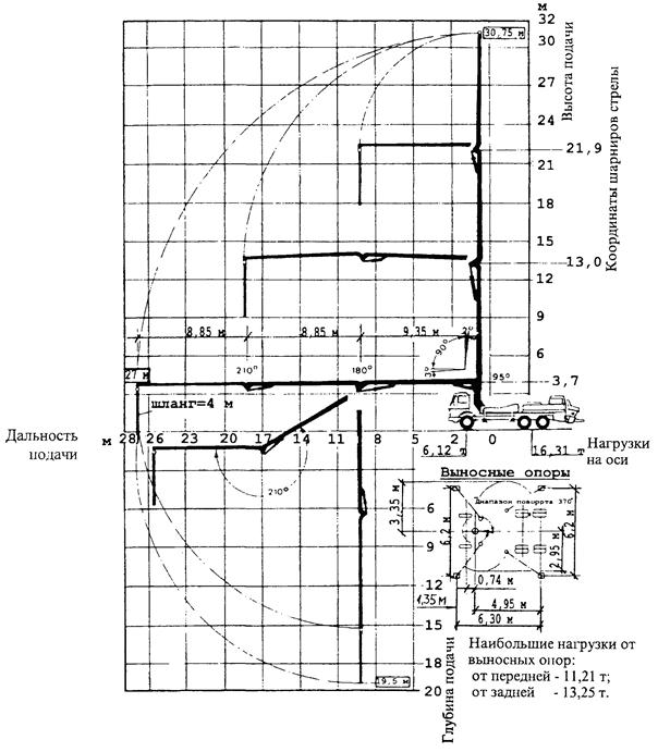 3.2 Автобетононасос оснащен шарнирно-сочлененной распределительной стрелой, на которой укреплен бетоновод. С помощью этой стрелы с одной стоянки автобетононасоса бетон может быть подан в любую точку зоны работы.