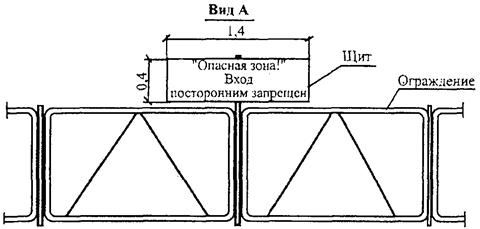 1 Площадка ограждается инвентарным ограждением высотой не менее 1,2 м. Пример ограждения площадки приведен на схеме. Количество предупредительных надписей и их расположение должно соответствовать схеме.