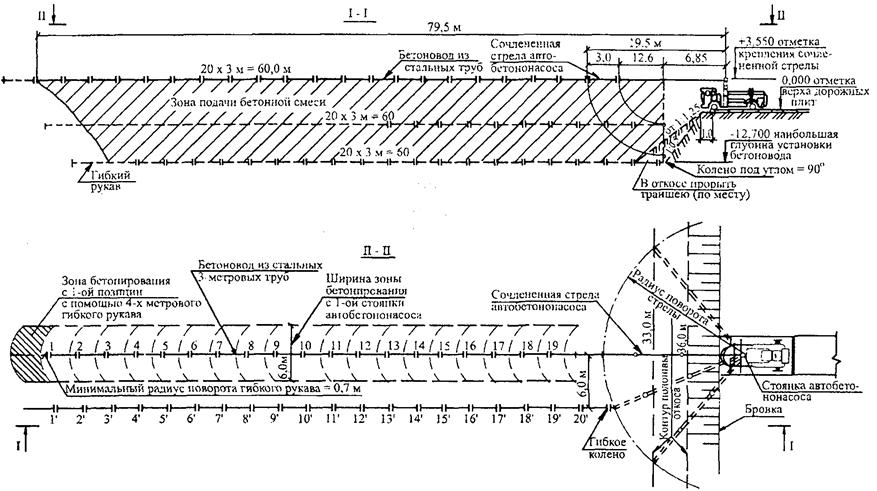 4 При необходимости в откосе котлована у мест стоянки автобетононасоса устраивают узкие траншеи шириной до 1 м для размещения стрелы автобетононасоса, как показано на сечении I-I.