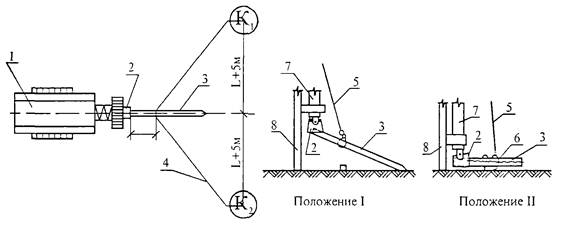8.4.4 При подъеме стрела (башня) копра, смонтированная в горизонтальном положении, должна поддерживаться оттяжками и тормозными тросами. При выводе стрелы в вертикальное положение тормозные тросы и оттяжки не должны иметь слабину. Во время подъема стрелы все работы в опасной зоне должны быть прекращены.