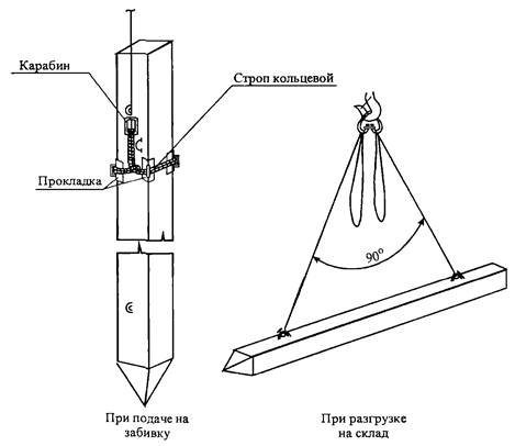 8.4.11 Сваи стропят в фиксированных точках или за петли. При недостаточной высоте подъема крюка копра захват сваи может быть осуществлен на расстоянии не более 1/3 длины сваи, считая сверху. На ребра сваи должны быть уложены и привязаны к тросу или свае прокладки для предохранения троса от резких перегибов и перетирания. Освобождать сваи от такелажной петли разрешается только после посадки и закрепления на них забивного снаряда.