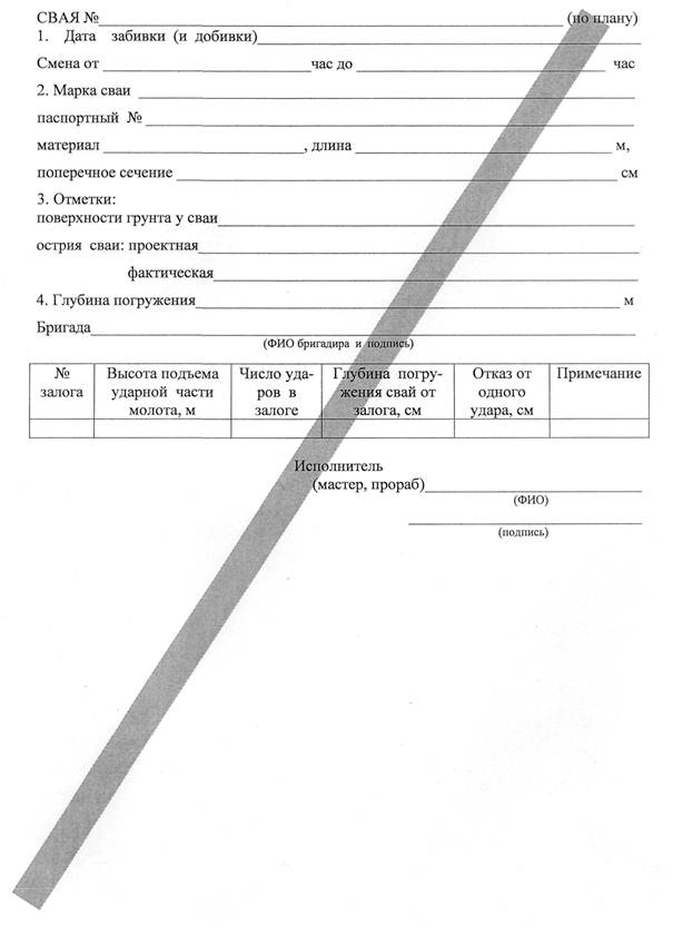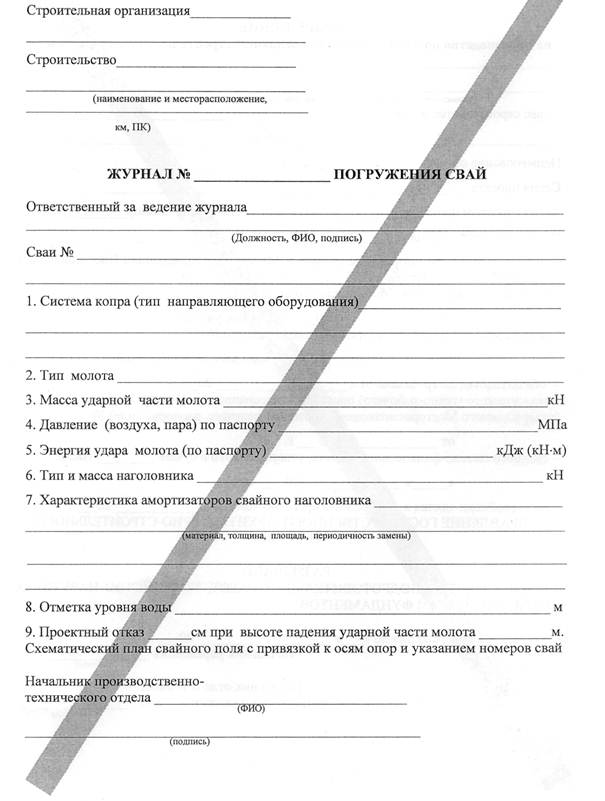 1.10 В процессе забивки свай должен вестись «Журнал погружения свай» согласно приложению Б, все страницы которого должны быть пронумерованы, прошнурованы и скреплены печатью строительной организации.