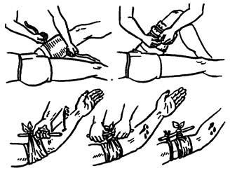 Нельзя касаться руками обожженного участка кожи или смазывать его мазями, маслами, вазелином и т.д. Обожженную поверхность обработать одеколоном, после чего наложить сухую стерильную повязку. Не следует вскрывать пузыри или отрывать от ожоговой поверхности приставшие к ней остатки одежды. Ткань обрезать по границе ожога и наложить повязку на обожженный участок.