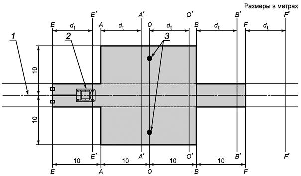1 - траектория движения; 2 - положение микрофона; А - А, В - В, Е - Е, F - F - опорные линии