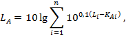 Расчёт уровня звука (дБА) при измерениях шумомером в октавных полосах частот (дБ) рассчитывают по формуле: