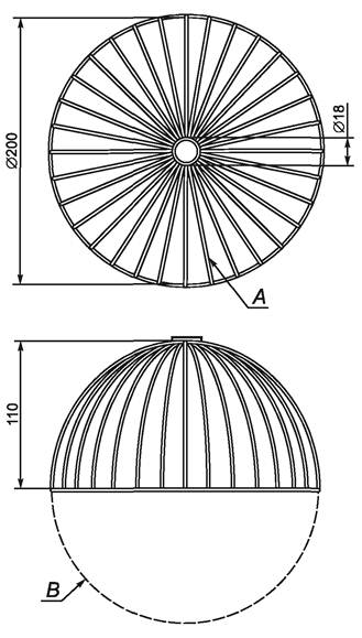 A - каркас, состоящий из 32 равномерно расположенных проволок диаметром (1,5 ± 0,5) мм; B - расположение деревянной сферы