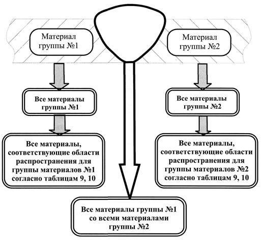 Аттестация по сварке контрольных соединений деталей из определенной марки материала распространяется на все марки материала, входящие в одну группу с материалом контрольного сварного соединения (Приложение 17, табл. 1, 2), а также на материалы других групп в соответствии с Приложением 17 табл. 9, 10.