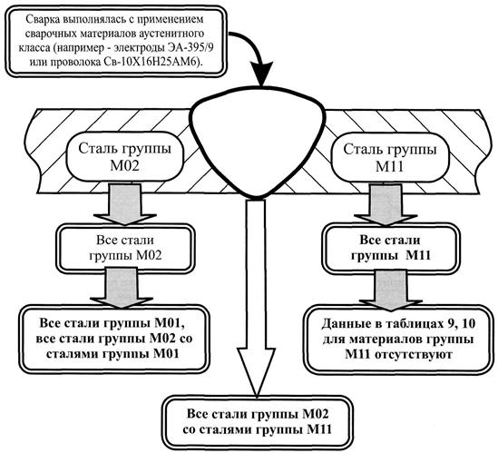 Комментарий: Например, при сварке КСС из стали группы М02 область аттестации распространяют на сварку деталей из материалов М01; М02; М02 с М01. При сварке КСС из марок материалов разных групп, область аттестации распространяют на соответствующие группы основных материалов табл. 1, а также на группы основных материалов с учетом области распространения, приведенной в табл. 9, 10. Например, при сварке КСС из стали группы М05 со сталью группы М04, область аттестации распространяют на сварку деталей из материалов групп М05; М03; М02; М01; а также М05 с М03; М05 с М02; М05 с М01; М04 с М02; М04 с М01 и М05 с М04. При сварке КСС из стали группы М11 со сталью группы М02, область аттестации распространяют на сварку деталей из материалов групп М11; М02; М01; М11 с М02; М02 с М01. При этом во всех случаях обязательно учитывается примечание к Таблице 10: При сварке изделий из материалов различных групп марка присадочного материала по химическому составу должна соответствовать группе основного материала контрольного соединения. |