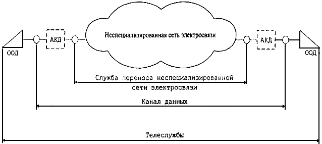 1.4. Сети ПД не включают в себя оконечное оборудование данных (ООД). Соответственно, службы ПД не включают в себя функции ООД. Рекомендуемое Международным союзом электросвязи (МСЭ) в Рекомендации F.600 взаимоотношение ООД и службы ПД показано на рис. 1.1.