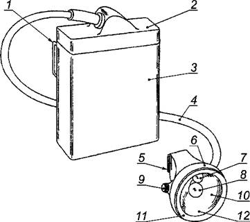 7- ушко для ремня; 2- защитная крышка; 3 - корпус батареи; 4 - кабель; 5-клипса на каску; 6 - фара; 7- дополнительный источник света; 8 - основной источник света; 9 - кнопка выключателя; 10 - рефлектор; 11 - обрамляющее кольцо; 12 - защитный светопропускающий элемент