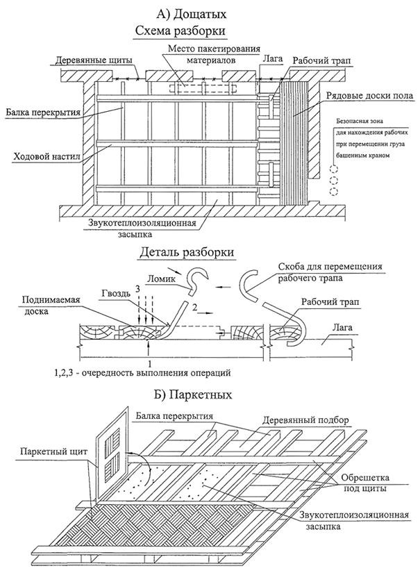 Рабочие трапы укладываются непосредственно на три смежные лаги и по мере разборки досок пола перемещаются по лагам к очередной разбираемой доске с помощью металлической скобы из арматурной стали AI Æ 12 ... 14 мм длиной 1,0 м.