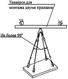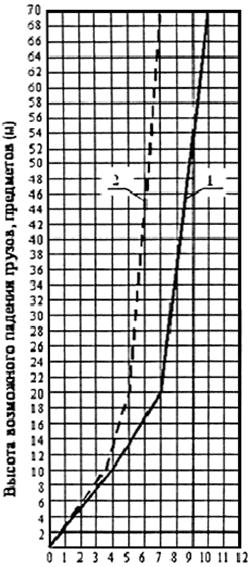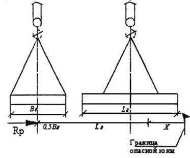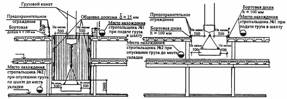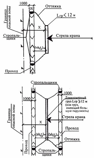 - безопасных расстояний от низа перемещаемого груза до наиболее выступающих по вертикали частей здания или сооружения (должно быть не менее 0,5 м, а до перекрытий и площадок, где могут находиться люди, не менее 2,3 м), а также высоты стропов (траверсы);