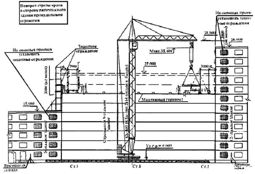 - обеспечение безопасного расстояния от сетей и воздушных линий электропередач, мест движения городского транспорта и пешеходов, а также безопасных расстояний приближения кранов к строениям и местам складирования строительных деталей и материалов;