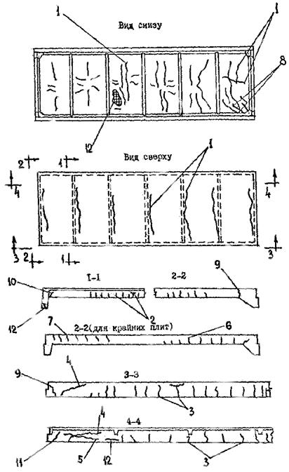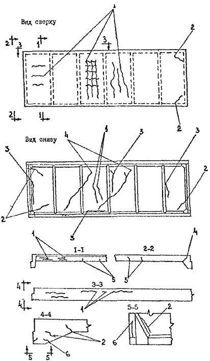 Основную информацию о техническом состоянии железобетонных конструкций получают по характеру развития трещин, деформациям элементов, отслоениям защитного слоя, коррозии арматуры и бетона, отклонениям положения конструкций от предусмотренного проектом (в т.ч. площади и длины опирания) и любым другим несоответствиям.