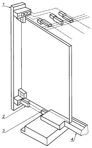 1 - типовая горизонтальная деталь блочного каркаса; 2 - гнездо ловителя, установленное на блочном каркасе; 3 - ловитель; 4 - линия шага выводов
