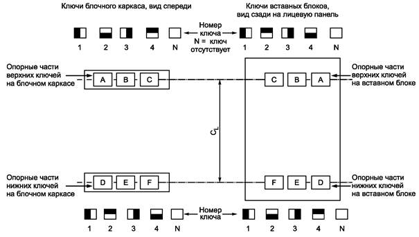 Примечание - Соответствующим гнездам для установки ключей на блочном каркасе и вставных блоках присвоены одинаковые буквенные обозначения. Показанный на рисунке порядок нумерации ключей предусмотрен для того, чтобы избежать блокировки вставного блока с таким же набором ключей, что и у блочного каркаса. В случае установки в соответствующие гнезда вставного блока и блочного каркаса ключей различного положения произойдет блокировка данного вставного блока и его невозможно будет вставить в каркас. На задней части блочного каркаса/вставного блока буквенные обозначения А, В, С расположены на нижней части, а буквенные обозначения D, E, F - на верхней. На задней части буквенные обозначения проставлены в обратном порядке.