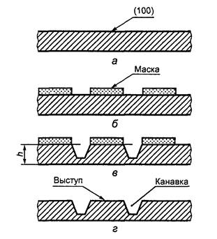 h - глубина травления; г - пластина после удаления технологической защиты с элементами рельефа