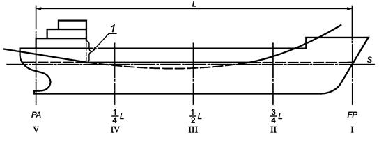 В.1.1 Необходимо использовать масштабный чертеж, чертеж общего расположения, продольный разрез ил и чертеж грузовместимости или подобные чертежи, на которые нанесена летняя грузовая ватерлиния S (см. рисунок В.1).