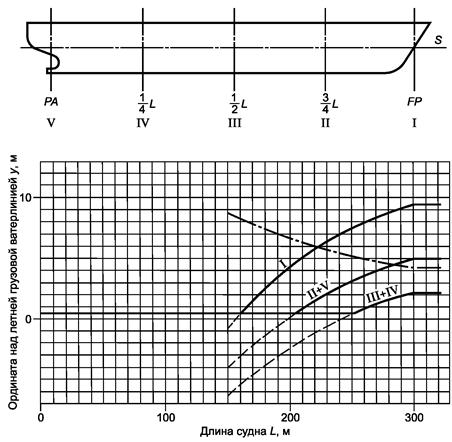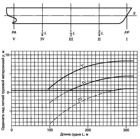 2 Коэффициент общей полноты (Сb = 0,6) принимают наиболее неблагоприятным для судов всех длин. Для крайних ординат I и V разница между наименьшей и наибольшей ординатами от летней грузовой ватерлинии составляет приблизительно 3 и 1 м соответственно при изменении Сb от 0,6 до 0,8.