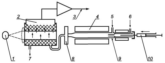 1 - УФ-источник; 2 - фотоумножитель; 3 - выходной