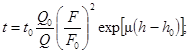 где h0 и h - радиационные толщины при определении t0 и просвечивании сварного соединения, см; Q0, Q, I0 и I - активность источника и ток рентгеновской трубки при определении t0 и просвечивании сварного соединения; F0 и F - расстояние от источника излучения до радиографической пленки при определении t0 и просвечивании сварного соединения; µ - линейный коэффициент ослабления широкого пучка излучения.