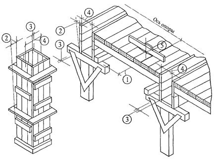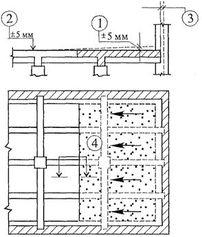 1 - рейка; 2 - нивелир; 3 - обноска; 4 - проволоки, фиксирующие оси; 5 - опалубка