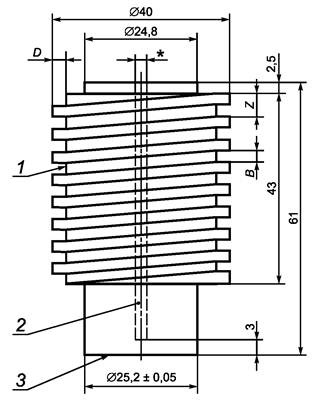 Нагревательный цилиндр должен быть изготовлен из металла, выдерживающего температуру свыше 500 °С (например, из чистого никеля). Пример нагревательного цилиндра приведен на рисунке А.1. Контактная поверхность должна иметь диаметр (25,20 ± 0,05) мм и должна быть заземлена. В центре должно быть просверлено отверстие, заканчивающееся на 3 мм выше нижней поверхности нагревательного цилиндра. Отверстие предназначено для помещения датчика температуры, который необходим для регулирования температуры нагревательного цилиндра, диаметр датчика следует подбирать соответственно диаметру отверстия. Методом механической обработки в верхней части нагревательного цилиндра протачивается спиральный паз, имеющий глубину D, ширину В и шаг Z. Значения D, В и Z должны быть выбраны таким образом, чтобы проводники нагревателя можно было разместить в пазе по всей разогреваемой длине. Нагревательный цилиндр должен быть заключен в термостойкую изоляцию, оставляя свободной нижнюю контактную поверхность.