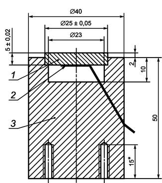 Калориметр (см. рисунок А.2) состоит из цилиндрического диска из черного анодированного чистого алюминия диаметром (25,00 + 0,05) мм и толщиной (5,00 + 0,02) мм, который закрепляется на опоре, изготовленной из полиамида 66. Верхняя контактная поверхность калориметра должна быть перед анодированием заземлена, а на нижней поверхности должен быть закреплен датчик температуры (например, платиновое сопротивление).