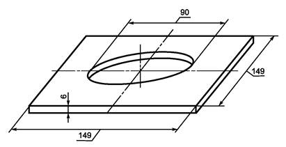 5.4 Установочная пластина калориметра, изготовленная из квадратного листа алюминия с длиной стороны 149 мм и толщиной 6 мм с круглым отверстием диаметром 90 мм, расположенным по центру (см. рисунок 4). Масса пластины должна составлять (264 ± 13) г.