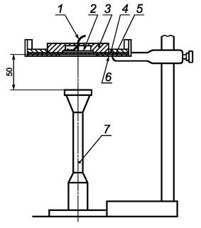 5.5 Опорный штатив, используемый для установки опорной рамы образца относительно горелки. Верхняя лицевая поверхность опорной рамы образца должна находиться на 50 мм выше верхней лицевой поверхности горелки и должна быть параллельна ей, причем ось горелки совмещается с центром отверстия в опорной раме (см. рисунок 5).