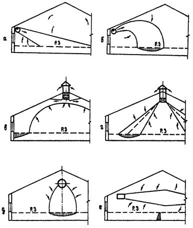 Рис. 1. Основные схемы организации воздухообмена в животноводческих помещениях приточными вентиляционными струями: