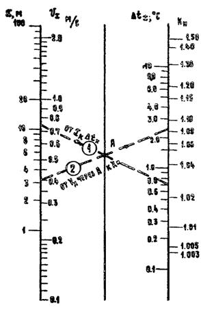 2) Из Vx = 0,54 м/с через точку А проводим луч АА, на пересечении со шкалой Kн находим Kн = 1,095.