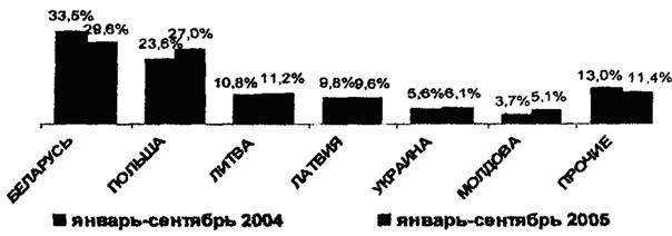 За 9 месяцев 2005 года по сравнению с 9 мес. прошлого года увеличились доли перевозчиков третьих стран на российском рынке международных автоперевозок, в том числе перевозчиков Польши (с 23,6 до 27 %), Литвы (с 10,8 до 11,2 %), Украины (с 5,6 до 6,1 %) и Молдовы (с 3,7 до 5,1 %) и снизились доли перевозчиков Беларуси (с 33,5 до 29,6 %), Латвии (с 9,8 до 9,6 %).