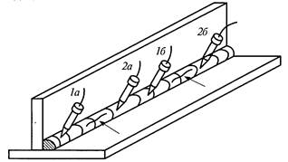 Контроль протяженного сварного шва с применением электромагнита для обнаружения поперечных трещин проводят способом приложенного магнитного поля по участкам (рис. П.11.17). Для обеспечения перекрытия соседних участков расстояние между местами установки полюсов 2а - 1б должно быть не менее 20 мм.