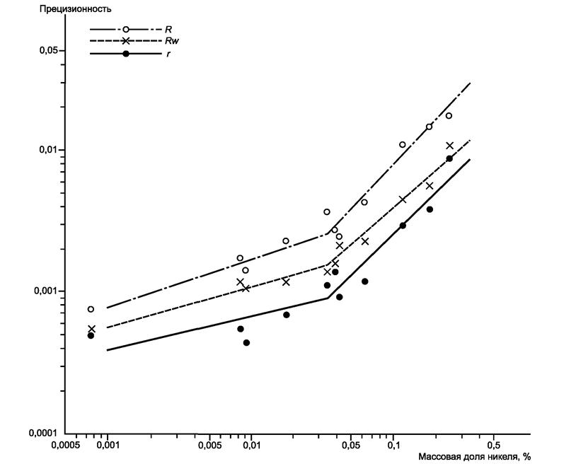 Массовая доля никеля менее 0,03 %: lgr = 0,2246 lg lgR = 0,3313 lg lgRw = 0,2791 lg |