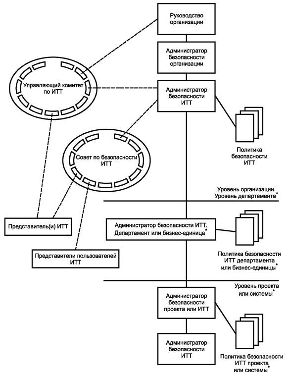 Пример отношений между администратором безопасности ИТТ, советом по безопасности ИТТ и представителями других структур в рамках организации, таких как пользователи и персонал ИТТ, показан на рисунке 4. Эти отношения могут носить управленческий или функциональный характер. В представленном на рисунке 4 примере организации безопасности ИТТ показаны три организационных уровня. Они в целом вытекают из классической организационной структуры, такой как корпорация/департамент или центр/бизнес-подразделение, но могут быть легко адаптированы применительно к любой организации увеличением или уменьшением числа уровней в соответствии с потребностями организации. Малые или средние организации могут возложить на администратора безопасности ИТТ все обязанности, связанные с безопасностью. Когда обязанности объединяются, важно обеспечить сохранение соответствующего контроля и баланса, чтобы избежать концентрации в одних руках слишком большой ответственности без возможности оказывать влияние или осуществлять контроль обязанностей.