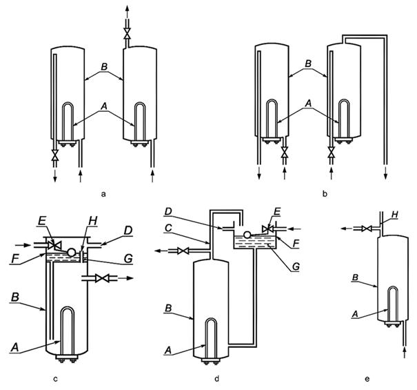 а - закрытый водонагреватель; b - водонагреватель со свободным сливом; с - водонагреватель, питаемый от отдельного резервуара; d - водонагреватель со встроенным резервуаром; е - водонагреватель низкого давления