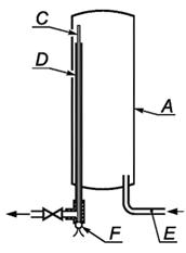 А - нагревательный элемент; B - бак; С - выходная труба; D - труба расширения; Е - шаровой клапан; F - уровень воды; G - резервуар; Н - вентиляционная труба