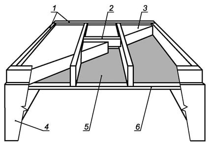 1 - каркас из бруса размерами 50 · 200 мм; 2 - поперечный элемент; 3 - термоизоляция; 4 - деревянная доска; 5 - нагревательный блок; 6 - покрытие