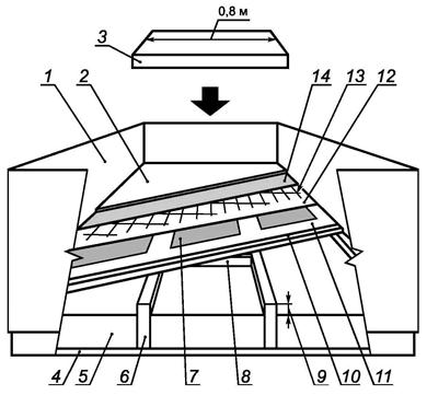 1 - деревянная доска; 2 - пол; 3 - кусок изоляции длиной 0,8 м; 4 - опора для термоизоляции; 5 - термоизоляция; 6 - каркас из бруса размерами 50 · 200 мм; 7 - нагревательный блок; 8 - поперечный элемент; 9 - воздушный зазор (если предусмотрен); 10 - фанера; 11 - дополнительный материал (если предусмотрен); 12 - дополнительная электрическая изоляция (если предусмотрена); 13 - сетка; 14 - дополнительный слой (если предусмотрен)