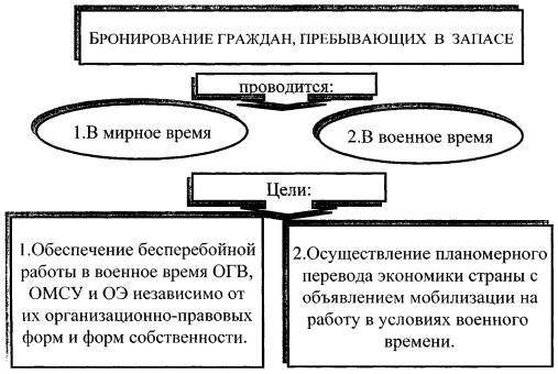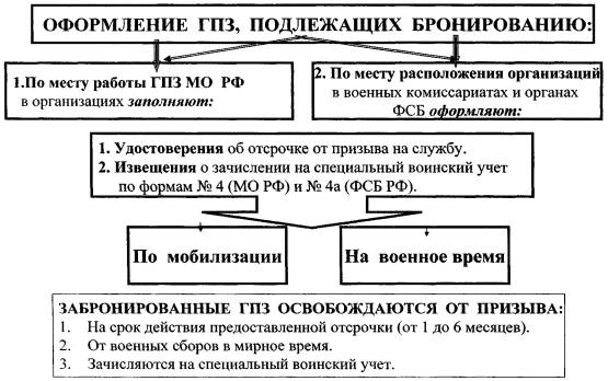 Бронирование граждан, пребывающих в запасе - организация и осуществление в мирное и военное время комплекса мероприятий по предоставлению отдельным категориям работающих граждан, пребывающих в запасе, отсрочки от призыва на военную службу по мобилизации и в военное время, а также от направления их для работы на должностях гражданского персонала Вооруженных Сил Российской Федерации, других войск, воинских формирований и органов.