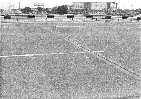 Вид участка примыкания к деформационному шву показан на рис. 3. На фотографии заметны переходы между выполненными по полосам перекрытия участками и хорошее качество стыка со старым полотном дороги. Высокая адгезия вяжущего, его эластичность способствует очень плотному примыканию литого асфальтобетонного слоя к металлоэпоксидной ремонтной конструкции деформационного шва. Механические свойства, присущие такому литому асфальту, позволили покрытию выдержать летнюю эксплуатацию при высокой температуре без заметного колееобразования в условиях высочайших транспортных нагрузок, а высокий коэффициент сцепления с колесами автомобиля обеспечил снижение аварийности на эстакаде.
