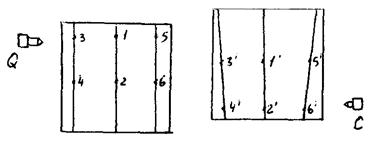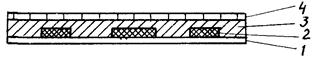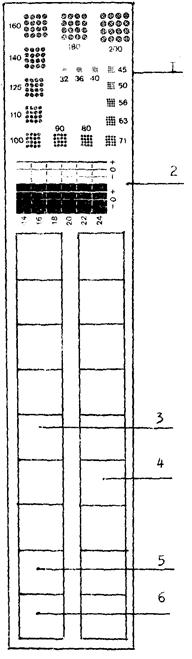 В углах листа на расстоянии 15 мм от каждой из сторон нанесены кресты (1, 2, 3, 4). Длины линий 1 - 2, 2 - 3, 3 - 4, 4 - 5, 1 - 3 и 2 - 4 между крестами измеряют на компараторе; они являются эталонными для определения геометрических искажений при копировании. В центре и углах на расстоянии 5 мм от крестов по диагоналям расположены миры для определения резкости и разрешающей способности.