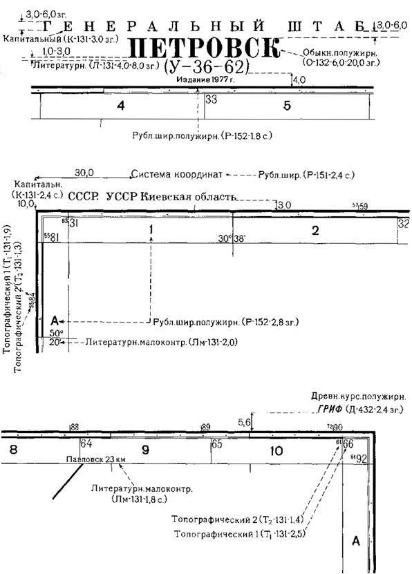 Математические элементы плана, важные объекты и элементы контура, печатаемые черным цветом на планах; все элементы контура на врезных картах |