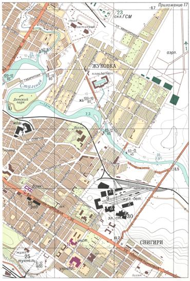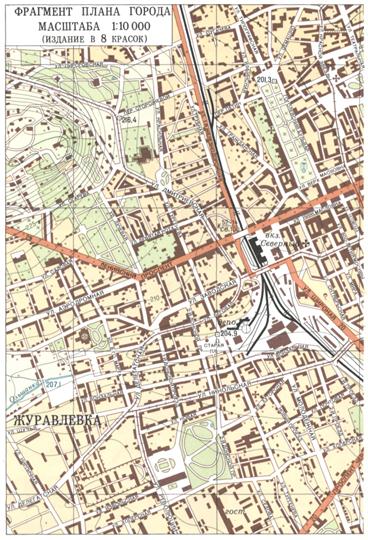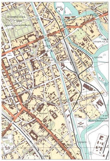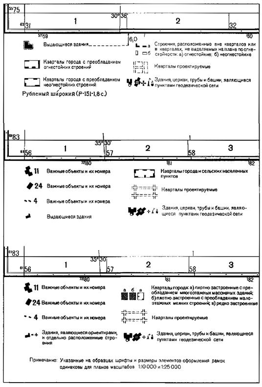 11. Графическое оформление планов городов масштабов 1:10000 и 1:25000 производится в действующих условных знаках для топографических карт соответственно масштабов 1:10000 и 1:25000 с учетом дополнений к ним (приложение 10). Врезки оформляются в условных знаках для топографической карты соответствующего масштаба и печатаются красками, цвета которых указаны в приложении 12.