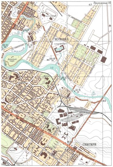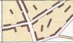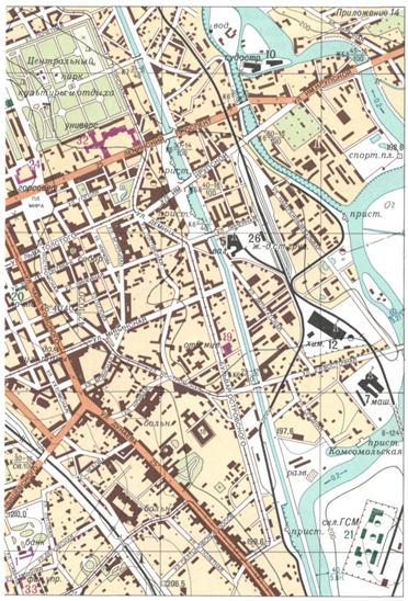 а) Плотно застроенные кварталы с преобладанием многоэтажных массивных зданий на планах городов с обобщенным изображением застройки б) Элементы контура, печатаемые коричневым цветом |