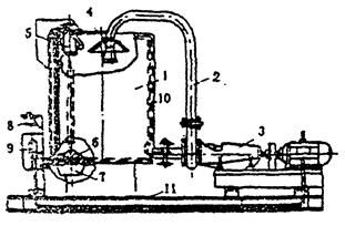 1 - рабочий бак; 2 - труба циркуляционная; 3 - насос марки ЗФ-12; 4 - разбрызгивающее устройство; 5 - пневмоцилиндр; 6 - пробковый затвор; 7 - воронка; 8 - воздухораспределитель; 9 - пульт управления; 10 - трубка подсоса; 11 - рама.