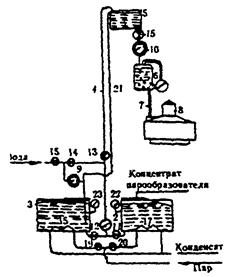 1 - бак для концентрата пенообразователя; 2 - центробежный насос (1,5 К-6); 3 - бак для рабочего раствора пенообразователя; 4 - трубопровод; 5 - расходный бак раствора пенообразователя; 6 - пеногенератор; 7 - пенопровод с приемной воронкой; 8 - бетоносмеситель; 9 ... 10 - дозаторы жидкости (ДРТ-1М); 11 ... 16 - пробковые краны; 17 ... 18 - паровые регистры; 19 ... 20 - краны; 21 - переливная труба; 22 ... 23 - термометры (ТС-100).