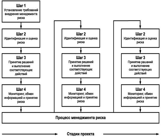 Менеджмент риска - непрерывный итеративный процесс. Он составляет неотъемлемую часть проектной деятельности и осуществляется в рамках существующих процессов менеджмента. Менеджмент риска в максимально возможной степени использует существующие элементы процессов менеджмента проекта.